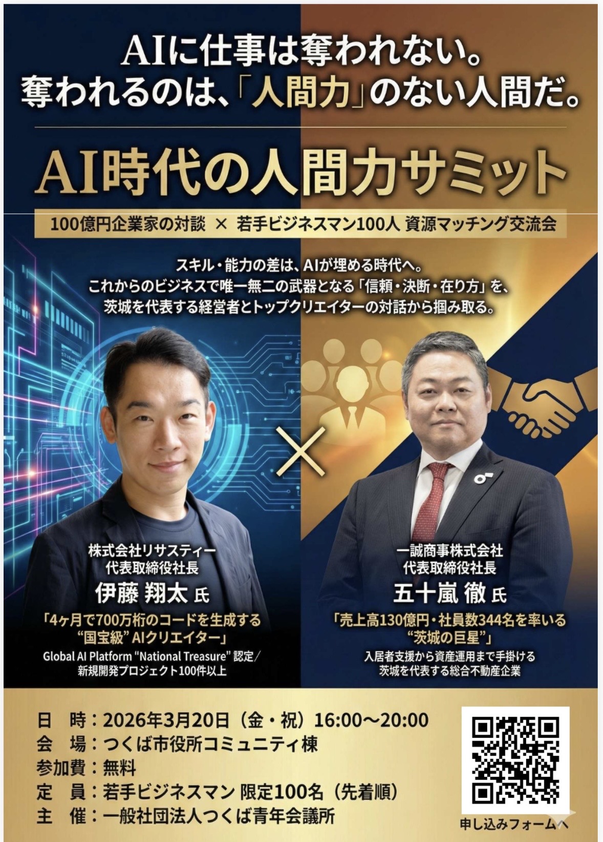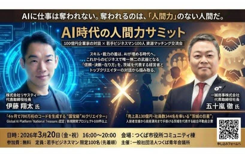 AI クリエイター 伊藤翔太氏と一誠商事株式会社 五十嵐 徹 先輩による、「AI 時代に重要な人間力とは?」の対談と「若手ビジネスマン 100 人 資源マッチング交流」を開催し、候補者に対するつくば青年所の認知度向上と会員拡大の機会としていただければと存じます。ご多忙中と存じますが、万障繰り合わせの上、ご出席くださいますようお願い申し上げます。
